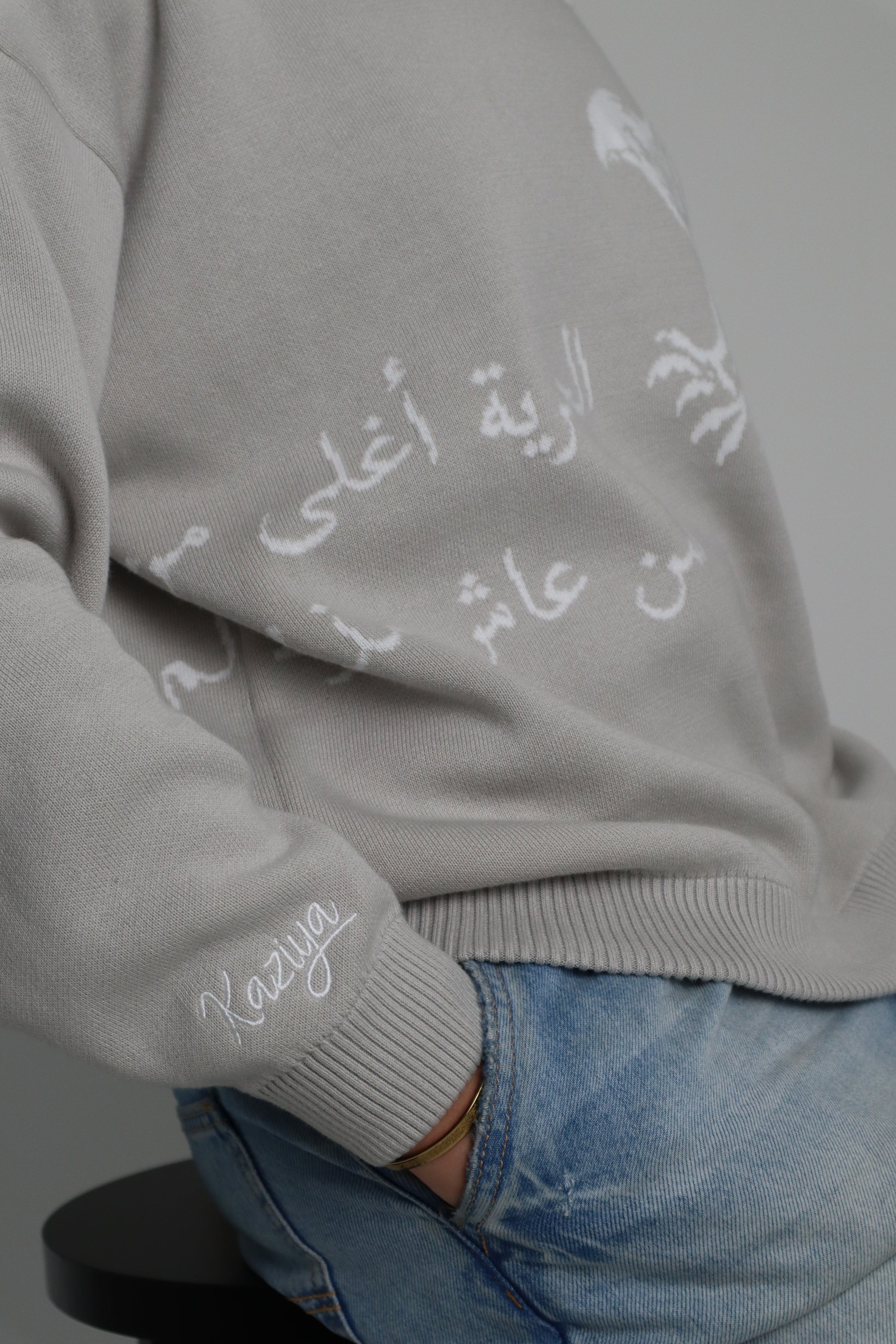 Subtle embroidered details complete the piece, including Kaziya branding on the sleeve and an embroidered Palestine emblem on the back, adding depth and intention without overpowering the design. Finished in a versatile stone colourway, this jumper blends meaning, quality, and everyday wearability.